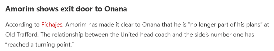 曼联主帅鲁本·阿莫林在0-1不敌阿森纳的比赛中,直接将29岁的喀麦隆门将安德烈·奥纳纳排除在大名单外,官方理由是他没有参加任何季前集训和热身赛。然而,西班牙「fichajes转会网」称,红魔主帅已经认定,奥纳纳不是自己未来长远计划的一员。